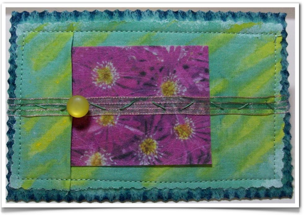just another little fabric postcard i made - the base is timtex, edged with a green marker. the background is a piece of white cotton streaked with acrylic inks.my pink flower photo was printed on to tap paper, and i colored the flower centers with a yellow marker before transferring the image to a piece of lutradur. i tucked the flower image into a little fold of the fabric, added ribbon and a button, and stitched it all down.
